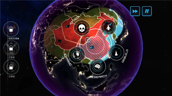首先,你会有几秒钟的时间来观察地球上其余的核势力(如果有侦查科技的话可以无视),然后会进入一片迷雾,只会看见你的领土和其周边地区。解释一下游戏中图标,首先你得点击一块自己的领土。