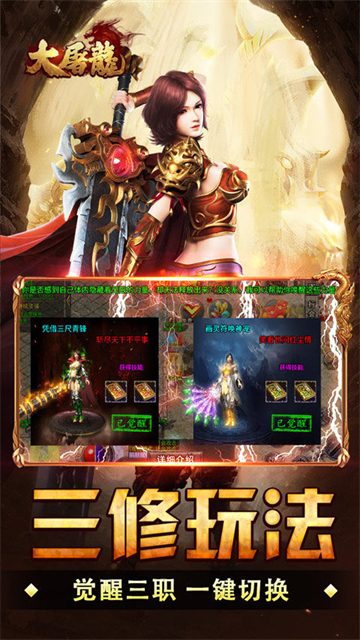 大屠龙传奇经典版是一款热血激情的传奇手游,完美融合经典与创新玩法,主打自由PK、爆装交易和兄弟攻沙。游戏采用经典战法道三职业设定,简化操作但保留传奇精髓,全民BOSS、神装特戒等高爆率玩法让散人也能逆袭,自由交易系统让装备保值变现。大屠龙游戏还提供了多人组队副本、跨服竞技和经典沙城争霸,带你重温千人同屏激战的快感,与兄弟并肩征战,打造属于你的传奇霸业。