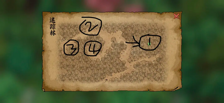 标记1,3各有一个灵芝;标记2有个牡配饰丹花;标记4是无名小村藏宝图位置