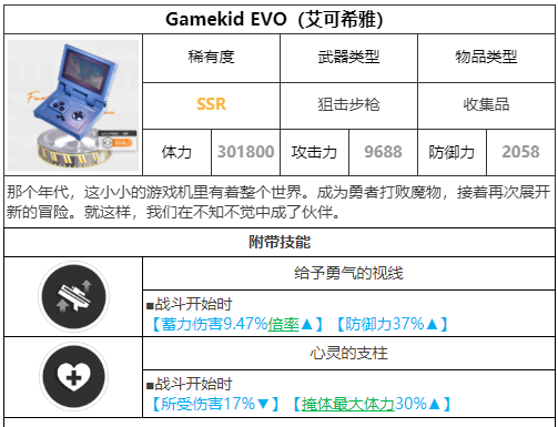 特殊评分:ex (与某些妮姬锁死绑定 例如黑白兔 黑白jk 这类型的角色在一队时会有加倍效果 目前游戏的EX角色强度为s以上)