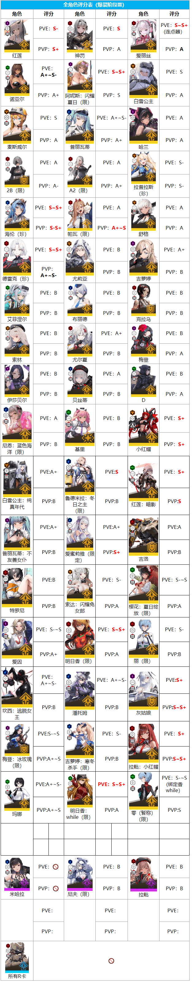 全角色评分表(爆裂阶段Ⅲ)
