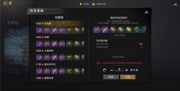 如果灵芝已经通关全部层数的无限塔,或暂时打不过更高层的无限塔,还可以通过扫荡功能来获取额外的资源。灵芝可以对已经通关的楼层进行扫荡,楼层越高,扫荡可获得的奖励越丰厚,每天4点会补充1次扫荡次数,最多累积3次,灵芝们别忘了每天都要扫荡一下哦~