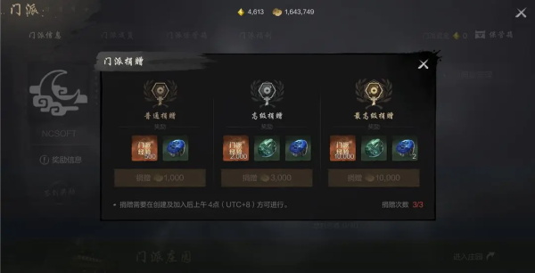 建议灵芝们都加入任一门派,门派不仅可以带来游戏中的归属感,更重要的是每天都可以从门派额外获取到养成资源。 每天签到都可以获得绑定神石的奖励,而通过门派捐赠,还可以获得大量强化石的奖励。每天都可以捐赠3次,花费不同数量的金币即可进行不同档位的捐赠,推荐进行最高级捐赠,花费少量金币即可获得大量强化石。