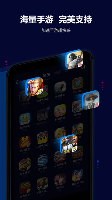 支持一键加速,为用户提供pubg m、王者荣耀等各类游戏的下载加速服务,方便用户快速进入游戏。