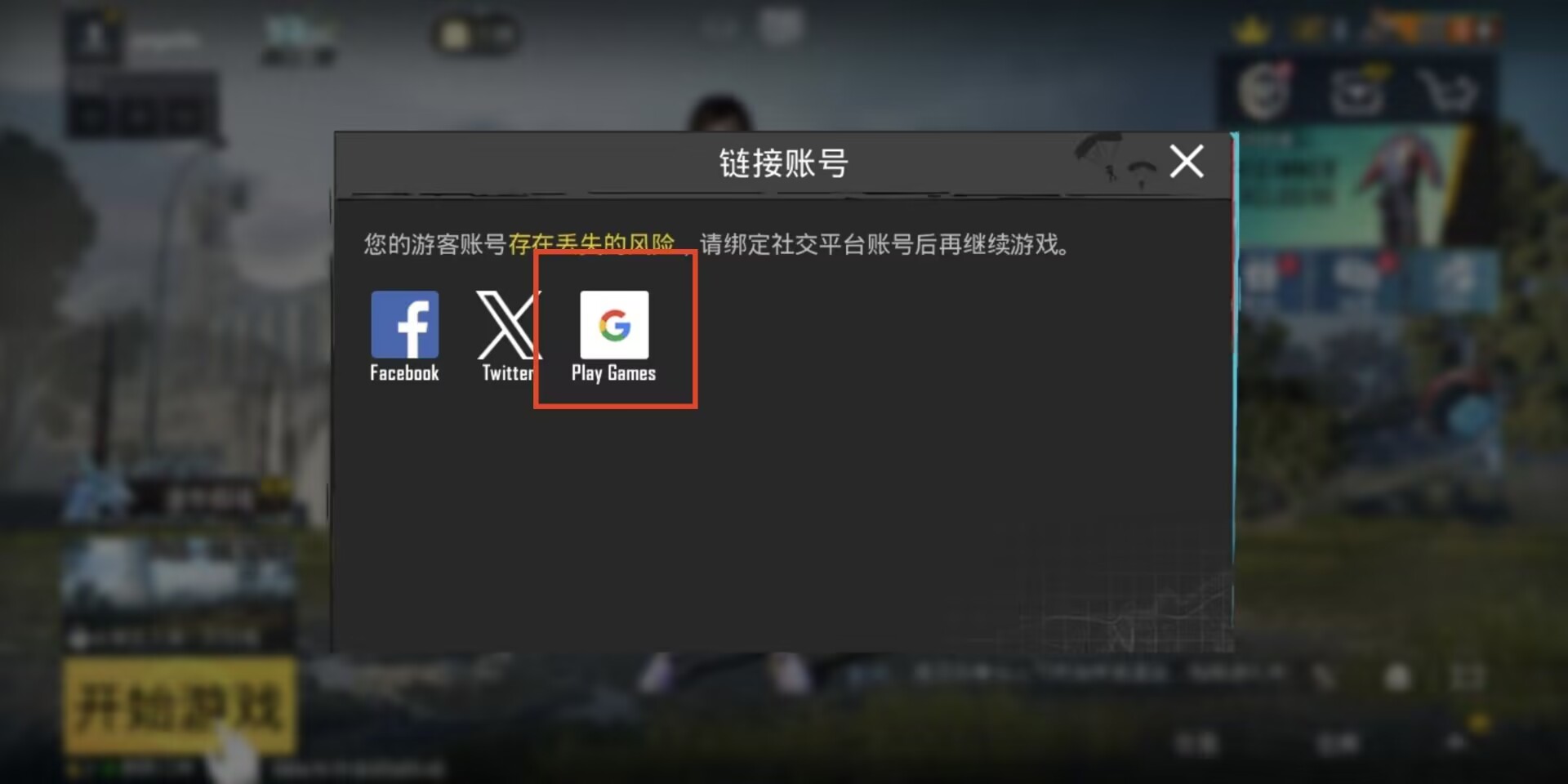 3、进入游戏并完成新手教程后,直接退出游戏重新进入。此时游戏会提醒您绑定账号。我们选择其中的“Play Games”,即谷歌登录。(唤起失败可能是因为您没有下载谷歌三件套)