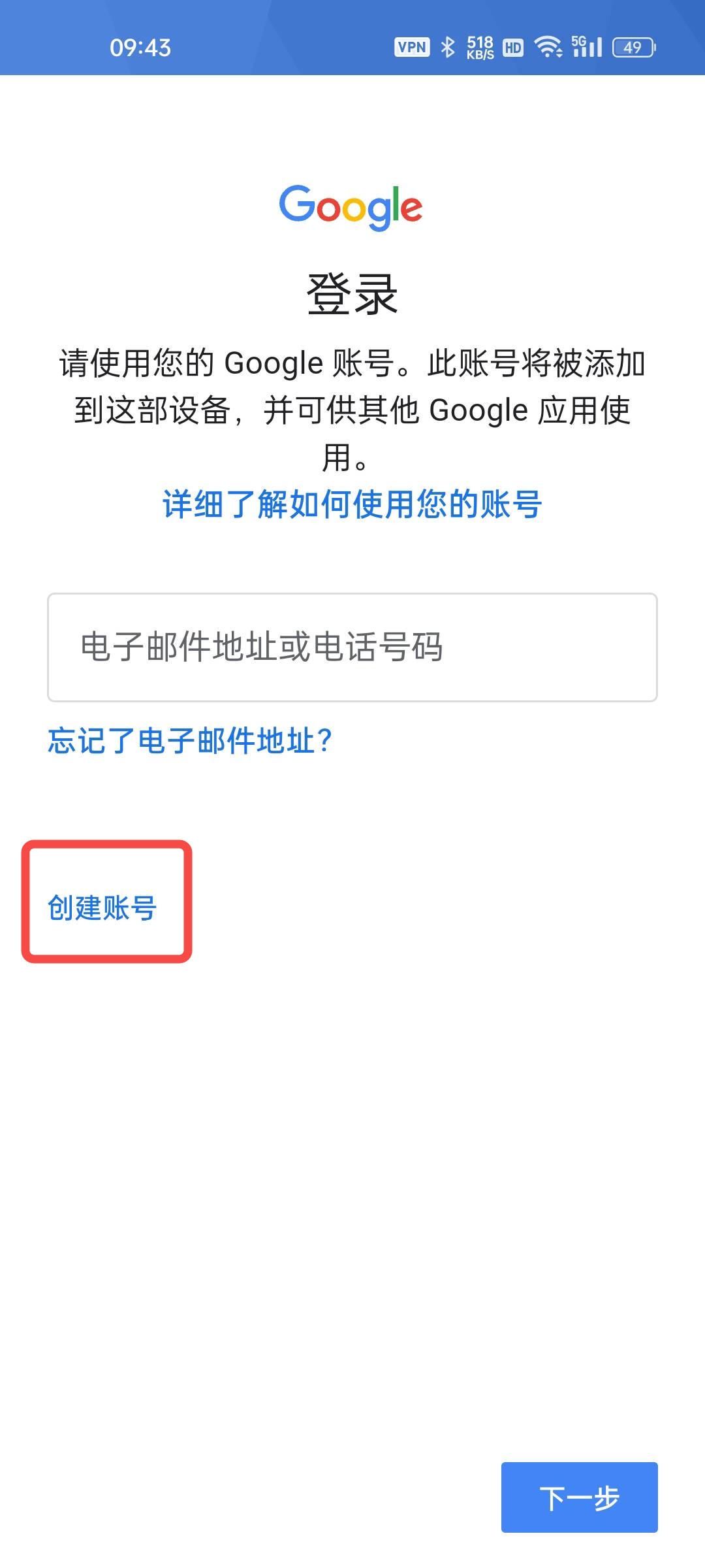 4、之后选择下方的“创建账号”,并输入您的姓名、出生年月、性别等信息。选择或创建您的Gmail地址后,输入您的密码并验证手机号,即可成功创建Google账号。