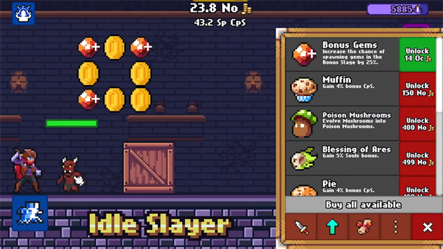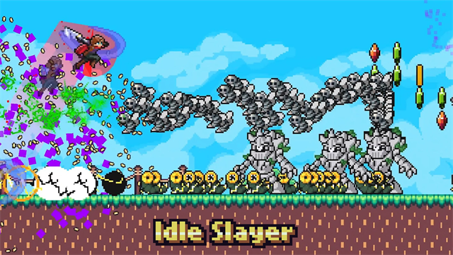 闲置猎手(Idle Slayer)是一款十分有趣的横版动作冒险闯关手游,采用经典的复古像素画风,搭配8Bit音乐,让玩家感受复古怀旧风的魅力,并且操作十分简单,玩家仅需点击屏幕控制角色跳跃、升级装备以及使用技能即可,战斗过程全程由控制的角色自动战斗,而且随着玩家不断游玩还可解锁更多强力武器和技能,强化后的武器以及技能将会为玩家金币收益带来更大的提升,所以获取金钱之后不要犹豫直接用来升级装备吧,并且挂机也可不断变强,非常适合休闲党在闲暇时间放松时游玩,不断养成自己的最强角色。