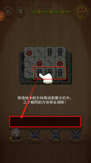 2、游戏玩法非常简单,只要将场地中的方块移动到展示栏中,三个相同的方块将会消除;