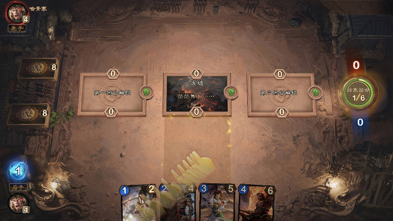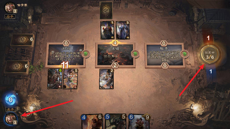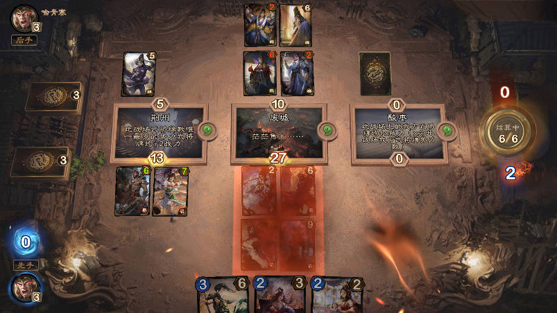 4、对局中下方为手牌区,每个回合摸一张自己卡组中的牌,手牌区手牌上限为7张,每个回合放入战场的武将粮草消耗量,不超过当前回合的粮草数。武将放入战场后,点击右边结束回合,先手玩家先亮武将(左边头像旁边有先手,后手),然后后手玩家亮,对局中可以长按战场右上方勾玉进行对该战场加倍,加倍后该战场变2勾玉,如果对方也在此战场加倍,则变为4勾玉。