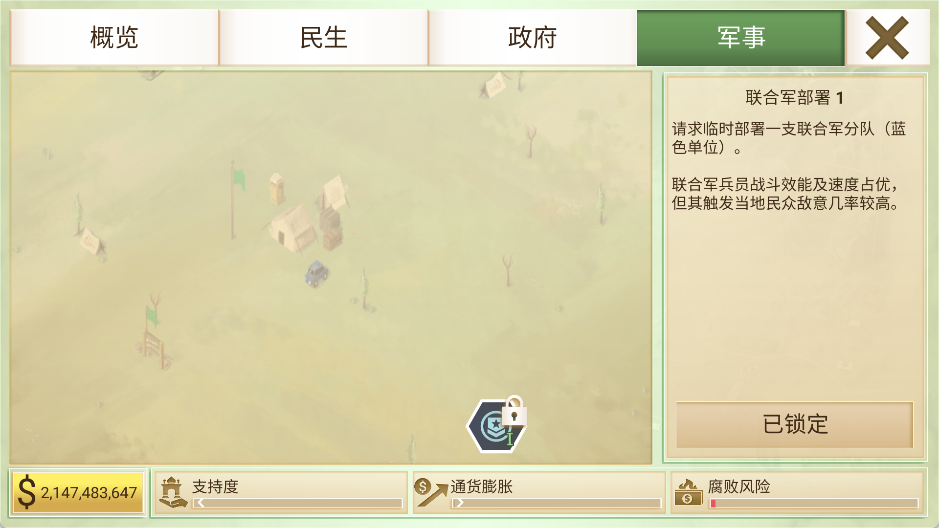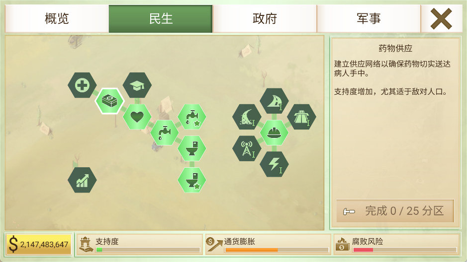 点击大部份点数时贪腐风险都会提升,尤其军事及发展相关民生点数,导致贪腐指数增加,最后影响声望及支持度,可以点开声望看一下腐败扣的声望有多少。在贪腐指数飙高前就要适时停手。但若声望有危险该花的钱还是要花,多点贪腐风险不高的民生点数,之后点反贪腐,或者点肃清贪腐,但之后还是得等贪腐风险降低。