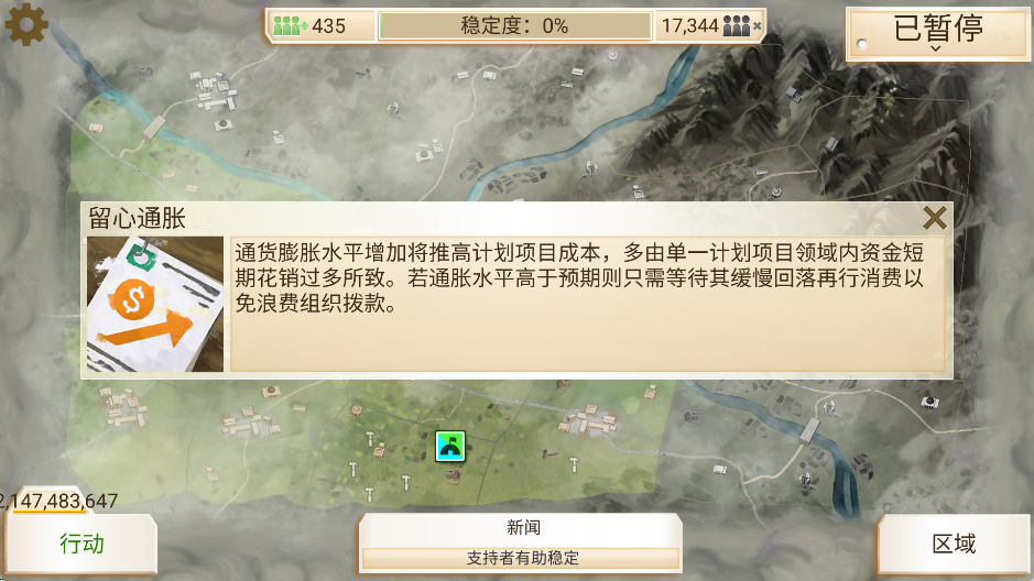 通膨会吃掉宝贵的钱,在资源不多的开局及局势紧张的中期是致命伤,所以养成等待通膨降低的好习惯,不要一下点太多,甚至练习一次点一个。简单模式时记一下无通膨时各点的花费,尽量控制在不贵两块的状况。在相同类型以及一定时间内投资太多项目,造成的通膨会越严重,所以要记得轮流在民生、政府、军事之间转换,降低同类别的通膨。改版之后如果超过100块会有浪费预算的嫌疑,后期如果不想增加贪腐,就用通膨吃掉多的钱吧!