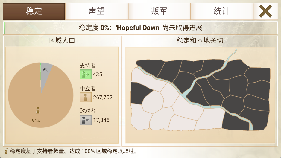 在某些状况及地图下,叛军占领过多区域,导致中后期就算其他地方都已经稳定,还是会扣一些声望。此时需要降低一些占领区域,优先从人口多的地区开始,接下来是容易打下的区域。需要观察一下声望的平衡点,直到谈判选威胁给的三点声望,能平衡掉叛军造成的声望损失为止,才能暂时回头发展民生。