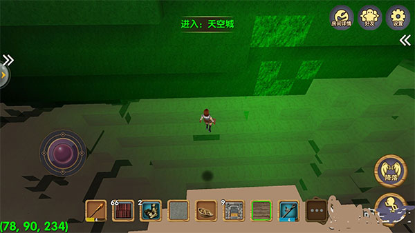 游戏的左下角有一个坐标指示,最后一个坐标接近200的时候玩家就到天空城了。天空城上有很多稀奇古怪的东西,白天只会出现小动物,到了晚上各种各样的大怪物就出现了。不过这种情况多出现在普通模式里,创造模式中玩家基本上很难遇到怪物,因为在这个模式中玩家是等同于上帝的存在。