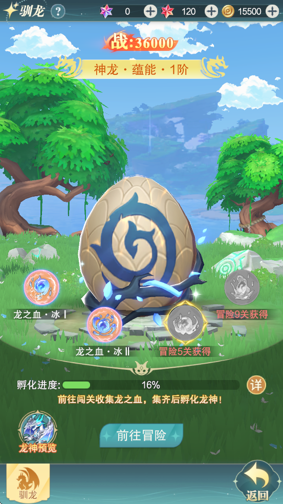 1、冒险闯关搜集孵化龙神所需要的龙之血,收集龙之血后可获得基础属性