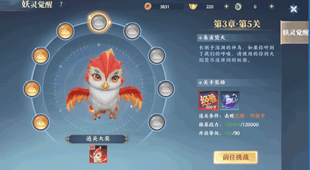打不过或打不了就先去"妖境"打装备或者过主线提升等级再来,过完第一章你就有了第一只妖灵朱雀,记得把它放上阵!