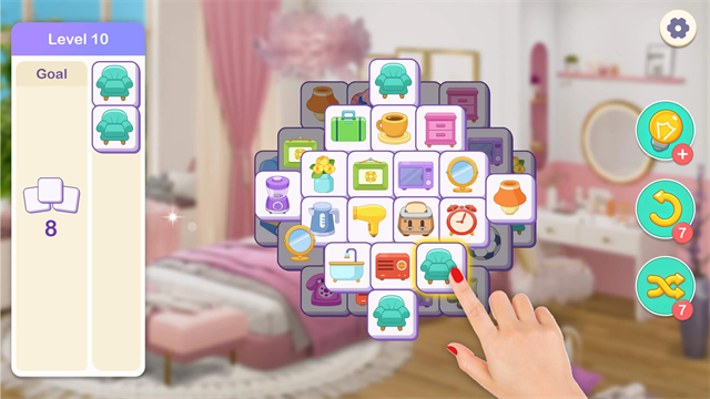 装扮小屋是一款画质超高的休闲小游戏,采用精美细腻的画面,温馨可爱的风格,玩起来非常治愈,在装修玩法的基础上加入了消除元素,给玩家带来前所未有的装修体验。游戏中你将化身成为设计师,根据自己的喜好来装扮房间,将各种的家具装饰摆放,打造个性化房屋,游戏的难度不高,但内容丰富,可以在这里解锁卧室,客厅,厨房等不同的区域,每完成一定数量的关卡还会有不同的道具奖励,一步步收集新的装扮来完成所有挑战。数百种家居,十几样装修风格等你来组合,玩家可以尽情想象,设计出更完美的房子。