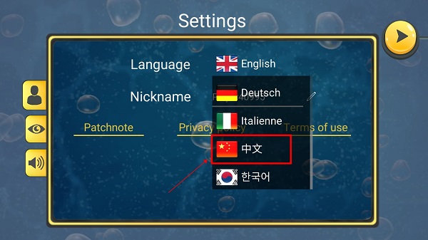 2、进入“Settings”界面-->点击“English”,弹出“语言”菜单-->滑动菜单,点击“中文”-->点击右上角“▶”即可设置为中文。