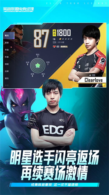 1、作为电竞经理,亲手打造一支自己喜欢的梦幻战队是无比激动人心的体验。我们根据选手们在过往赛季的客观数据及表现进行了初步的评级,随着新赛季的发展,我们还会根据选手在当前的实际表现进行动态调整。不仅如此,通过培养,经理人将与喜爱的选手共同成长,见证他们突破至更高评级,解锁或升级相关的特性技能。