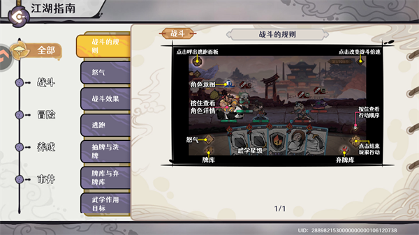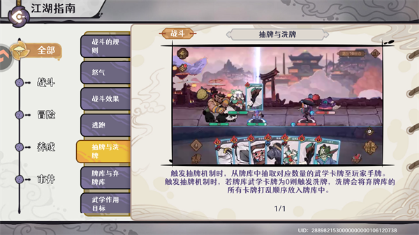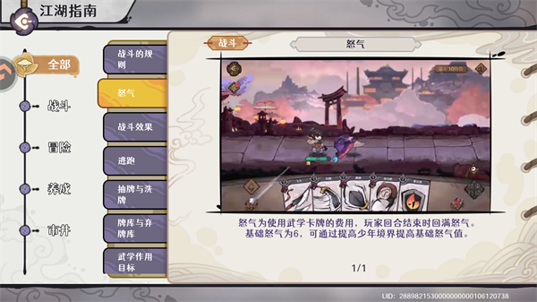触发抽牌机制时,从牌库中抽取对应数量的武学卡牌至玩家手牌。触发抽牌机制时,若牌库武学卡牌为0则触发洗牌,洗牌会将弃牌库的所有卡牌打乱顺序放入牌库中。怒气为使用武学卡牌的费用,玩家回合结束时回满怒气基础怒气为6,可通过提高少年境界提高基础怒气值。