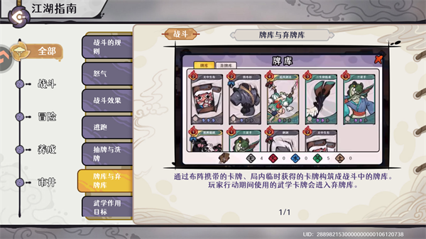 通过布阵携带的卡牌、局内临时获得的卡牌构筑成战斗中的牌库。玩家行动期间使用的武学卡牌会进入弃牌库。