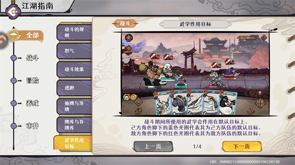 战斗期间所使用的武学会作用在默认目标上。己方角色脚下的蓝色光圈代表其为己方队伍的默认目标,敌方角色脚下的红色光圈代表其为敌方队伍的默认目标。