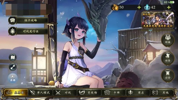 页面下方是游戏中全部界面的菜单选项,有单人模式、对战、竞技场、卡牌、商店和其他,页面右侧菜单为公告、邮箱、任务、好友以及直播。