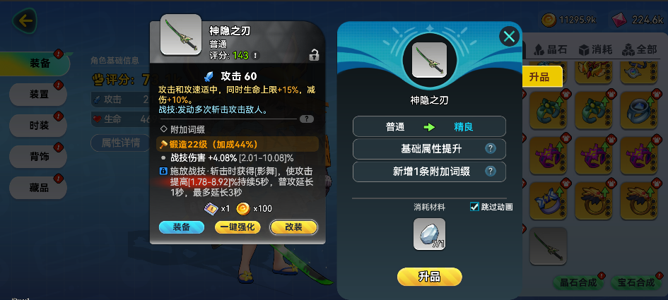 点击装备信息界面的改装按钮消耗对应品质的晶石,提升装备的品质。升品的装备可以获得一条新的随机属性或技能。