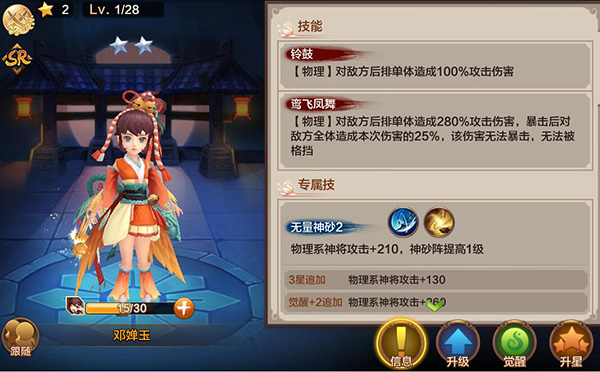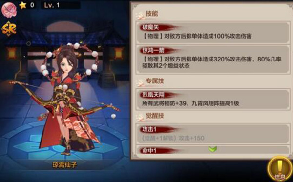 上阵后,因为缘分加成多,4星SR卡属性值更是高过1星SSR卡。所以目前看来SR卡也是值得培养的。下面就推荐一些个人比较喜欢的SR神将。
