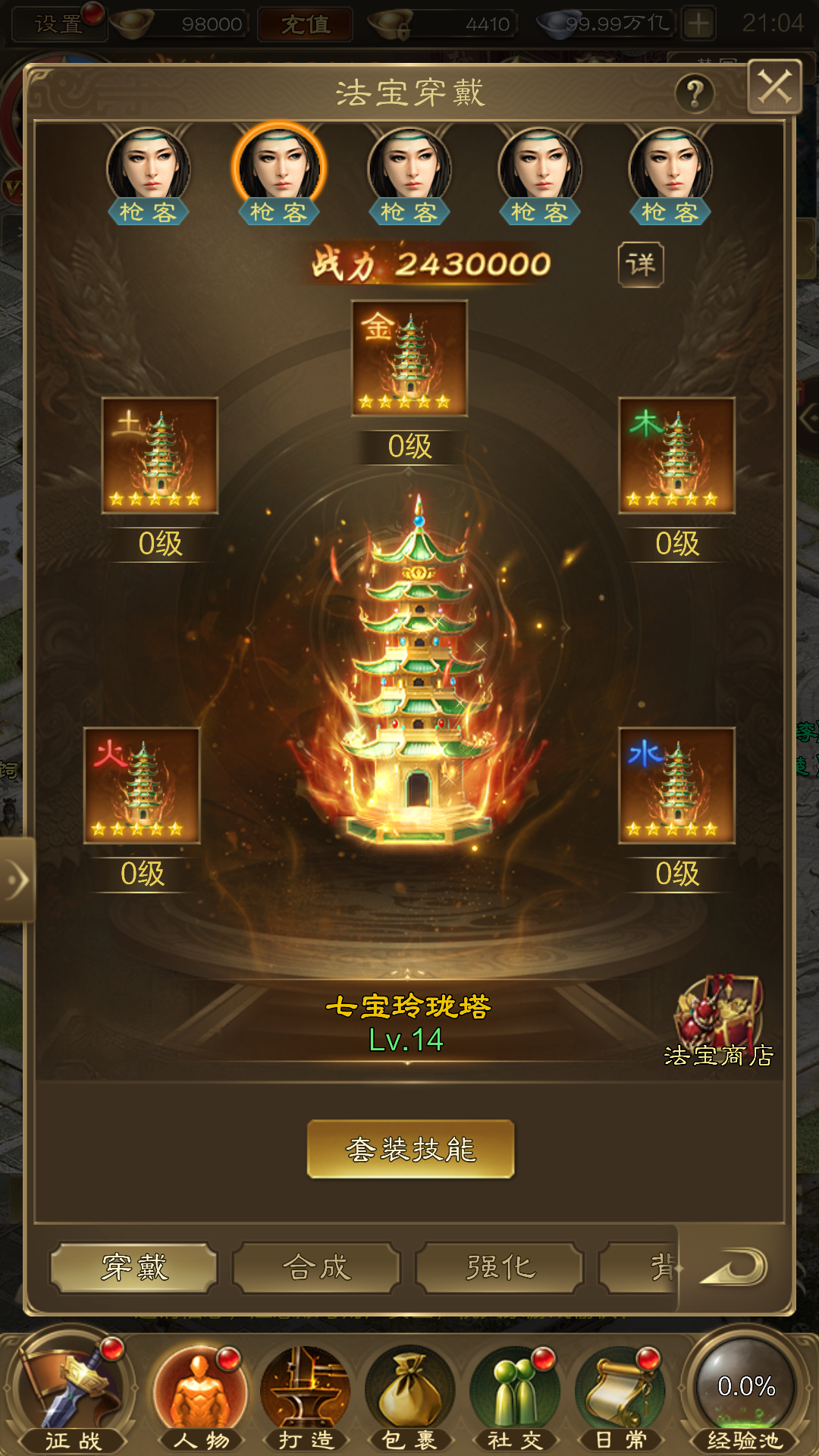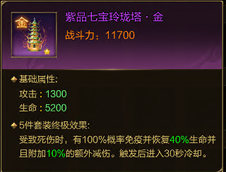 (4)七宝玲珑塔:受到致死伤害,必定免疫死亡并回复生命值,且额外增加一段时间的伤害减免效果