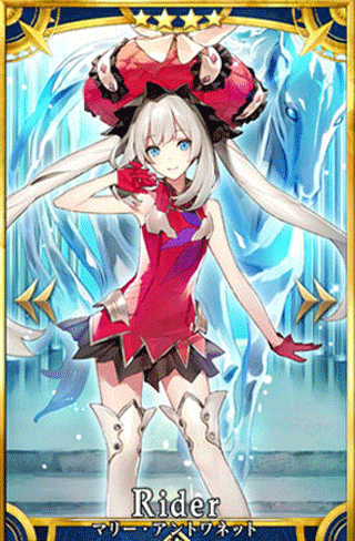 玛丽安托瓦内特:玛丽的技能基本上全是生存生存生存 无敌加上回血加上魅惑 对上男性敌人倒是真的能苟活很久 不过也因此没有加攻的BUFF 宝具虽是光炮可这伤害完全不能期待 虽然有全体DEBUFF解除外加回血的特殊效果 在某些特殊情况下很有用处 然而在国服是没什么卵用的 所幸还不至于是一无是处 勉强给个及格分吧
