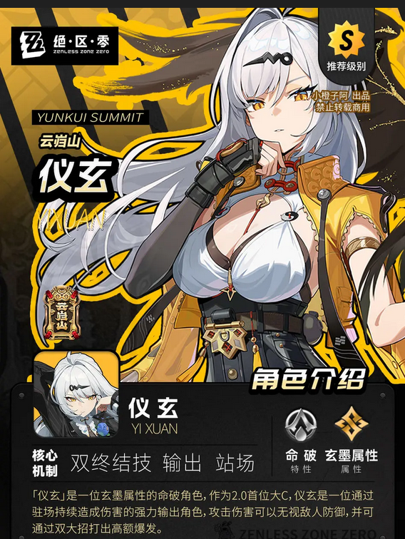 仪玄是一位玄墨属性的命破代理人,作为首位命破代理人,仪玄定位是长轴驻场主C,可以无视敌人防御造成贯穿伤害,搭配其双大招可以在战场上打出极致爆发。