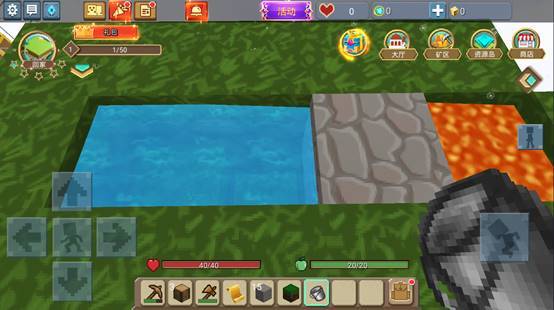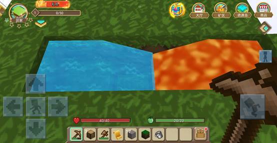 左边的坑是用来放水的,右边的坑是用来放岩浆,划重点:左边的坑第2个格子向下挖2块土地,这样会形成一个阶梯,水会向下流动!