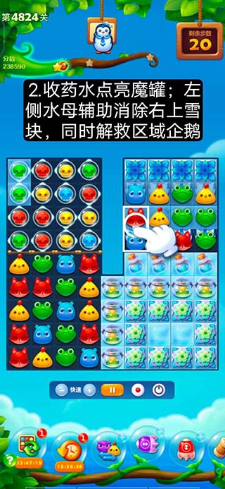 2、收集药水点亮魔法罐,同时解救区域企鹅。