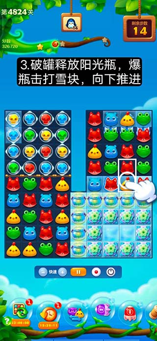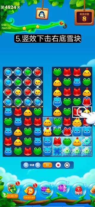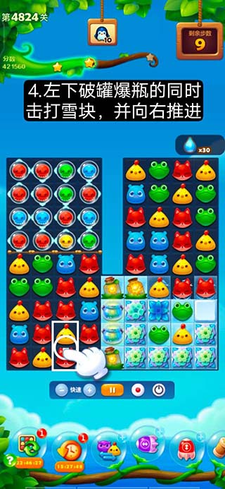 3、从左下和右上两个方向破罐击瓶,带动连消清理雪块,向右下区域推进。