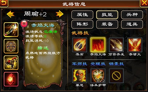 【赤炎火海:燃烧武将】 周瑜的第二个技能是赤炎火海,可以点燃地面燃烧对方武将!这个技能和上一个差不多,如果攻击上去了,烧起来还是蛮爽的!当然,周瑜等级上去了之后,大招要好用很多。