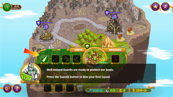 3、过关后能对各种兵种进行升级。点击基地或兵营,然后点击UPGRADE能进行升级。点击左下角的箭头能加速进行游戏;