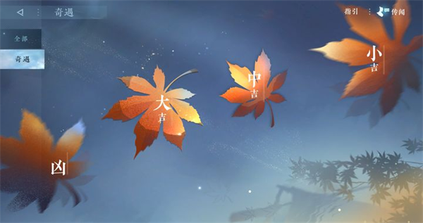 点击界面右上角的【菜单】-【开放世界】-【奇遇】页签可以打开奇遇界面,手游奇遇目前共分为大吉、中吉、小吉、凶这四类,但目前凶是没有开放的。
