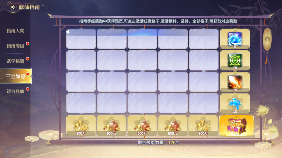 6、通过三宝如意残页激活格子,连线后可领取额外奖励。激活所有格子还能获得特殊大奖。领取当前奖励后页面将自动刷新,可继续使用残页激活新格子。