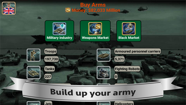 武器:雇佣兵,装甲运兵车(apc),坦克,火炮,防空导弹,直升机,喷气式战斗机,船舶,潜艇,战斗机器人,无人机(uav),航空母舰。