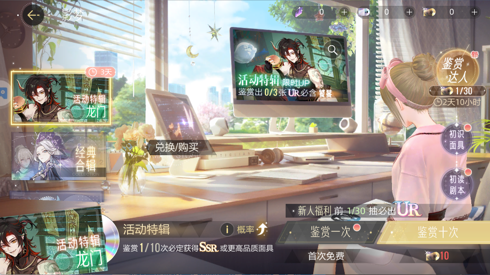 新人前30抽必出UR,活动特辑有概率UP,首次鉴赏免费,10连必出SSR及以上品质面具。