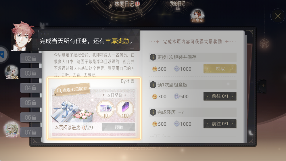完成当日任务可解锁日记进度并领取奖励,记得每日清完任务拿满福利。
