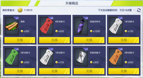 如果不小心输了,需要等待十分钟,才可继续挑战哦~不想等待的话,花费50钻石就可立即挑战!最后,获得的荣誉不要忘了去天梯商店中兑换哦!这里不仅可以买到训练卡,更有打折超值商品,最重要是不用花钱~有木有!