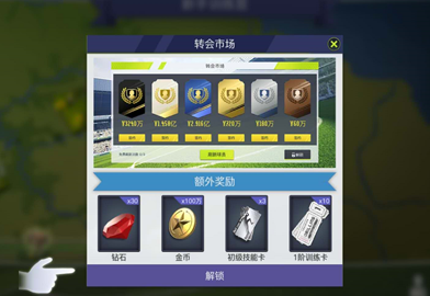 转会市场在新手训练营中的高级奖励中开启,之后玩家就可以在转会市场中使用金币购买心仪的球员。