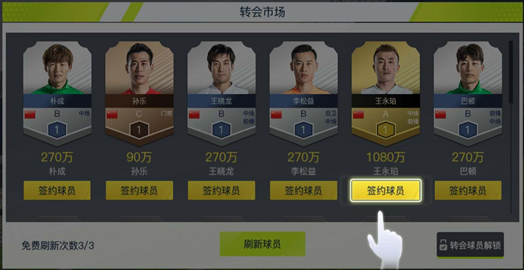 转会市场每天可以免费刷新3次,1次免费刷新机会需要6小时才能恢复,如果在没有免费次数的情况下刷新球员,就需要消耗钻石啦,各位玩家要合理使用免费次数哦~