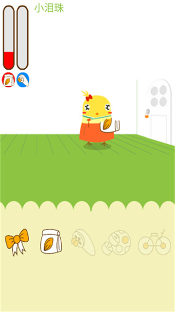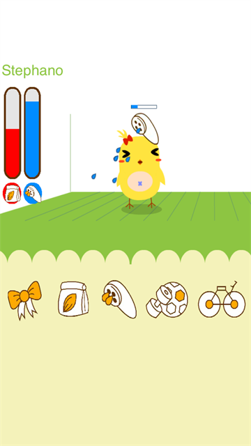 - 接着和你可爱的小鸡喂食洗澡玩游戏,我们可以给自己的小鸡喂食,只要拖动食物到小鸡嘴边,小鸡就会自己吃,不过是连包装袋一起吃,这样似乎有点不健康啊,制作组也太节约成本了吧。每吃一袋就会增加红槽的饥饿度(图示是增加,其实是减少)。给小鸡洗澡就更简单了,点击那个花洒的图标后,花洒就会自动地去帮小鸡完成洗澡,只需要洗一次小鸡的清洁度就会达到100%。给宠物喂饱洗干净就是对宠物好吗?错了!还得陪宠物玩,拿上这个足球,和宠物开心地玩吧,要注意玩足球的同时会让宠物的饥饿度增加和清洁度减少。