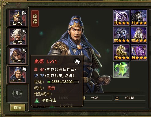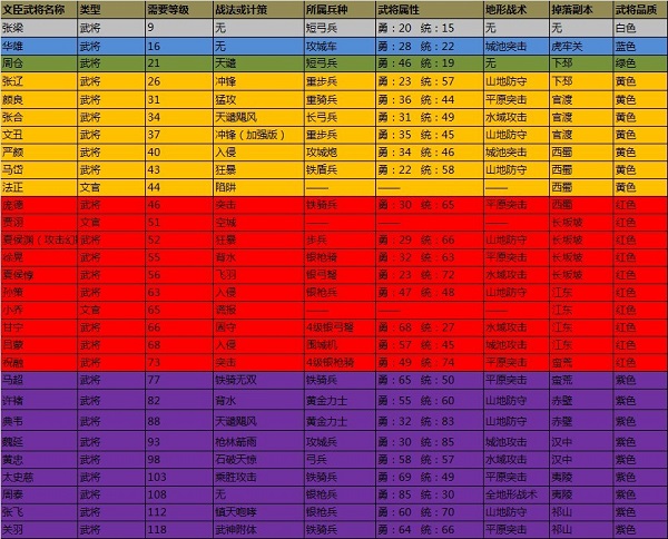 2.对于升级较快的玩家,46级招募庞德,中间夏侯渊可以直接不招,55级招募徐晃,56级招募夏侯惇,较弱的国家,66级招募甘宁,,如果国家较强,甘宁也可以选择不招募,68级直接招募吕蒙上阵四个武将,73级招募祝融下夏侯惇。