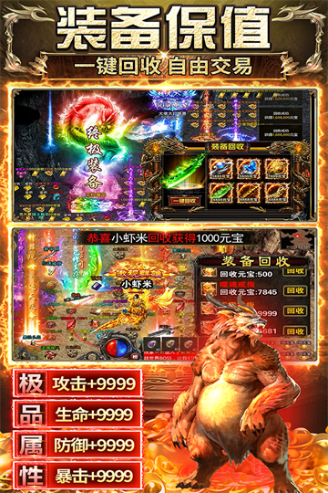 (1)本服所有装备都可爆,小怪也能爆极品,自由打宝全凭运气!自动回收、随身仓库特权统统免费送!