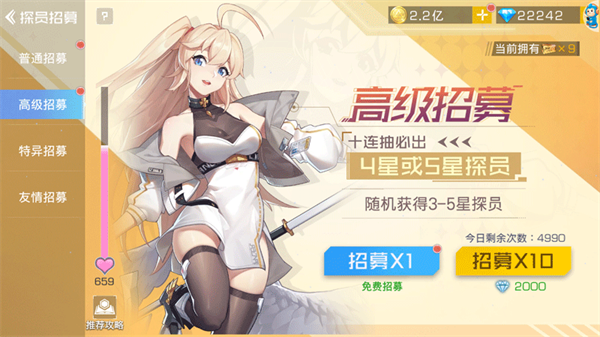游戏中所有探员均可通过召唤获得,探长大大每日均有1次免费的高级召唤及普通召唤次数,同时,游戏中支持召唤卷、友情积分及钻石召唤和特异召唤,十连召唤四星保底。攒够召唤积分也能随机获得一名5星探员!