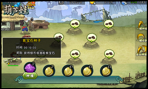 大家好,下面我们来聊一聊葫芦娃游戏中的农场系统。在我们完成单人第一章勇闯妖洞9即可开启农场,我们可以在空地上进行播种。
