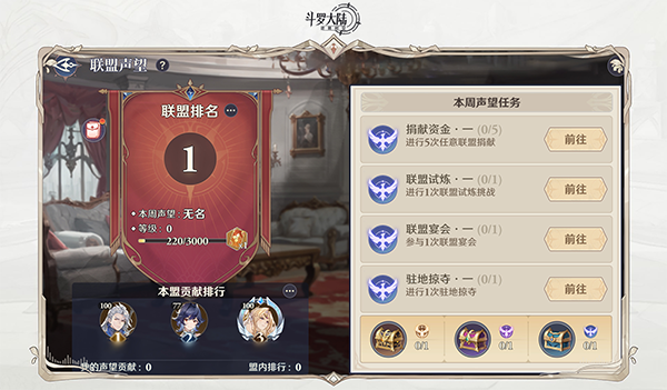 联盟声望本质上是联盟周常任务,按照任务陆续完成即可。每个任务有对应的勋章,不同的勋章可再下方领取各类宝箱。